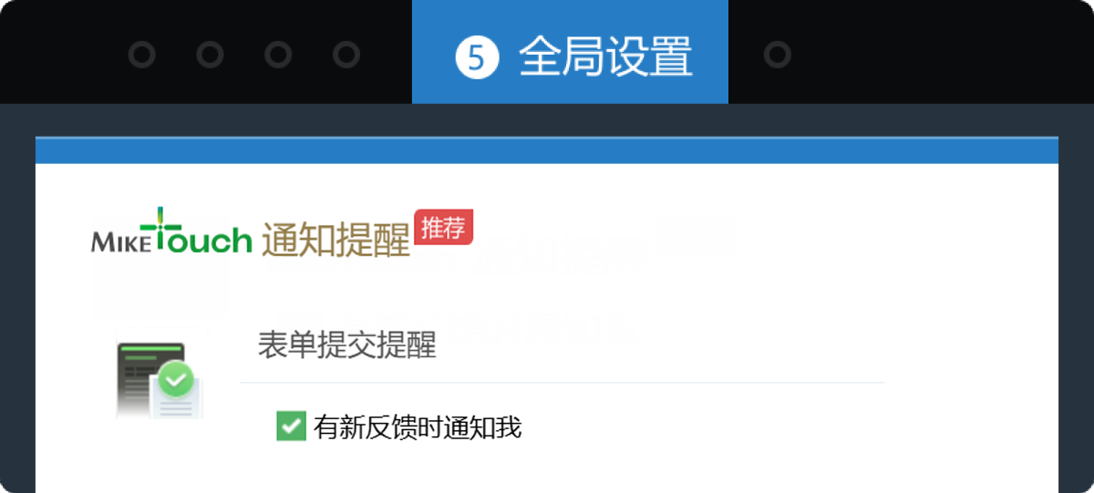 进入任意一个您想要接收反馈消息提醒的表单编辑页面,进入【全局设置】步骤,如下图所示勾选通过MikeTouch发送消息提醒,然后便可以在MikeTouch APP和客户端中即时接收到新反馈到达的通知了。