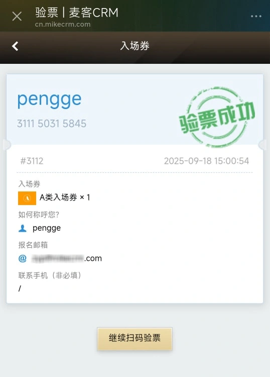 点击验票结果下方的“继续扫码验票”按钮,可以连续扫码验证下一张票券,现场操作更顺滑。