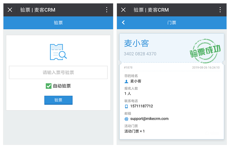 此外,您还可以在麦客的消息号服务中(下图右)查看表单列表时,点击表单记录右下角的“...”图标,进入手机验票页面。