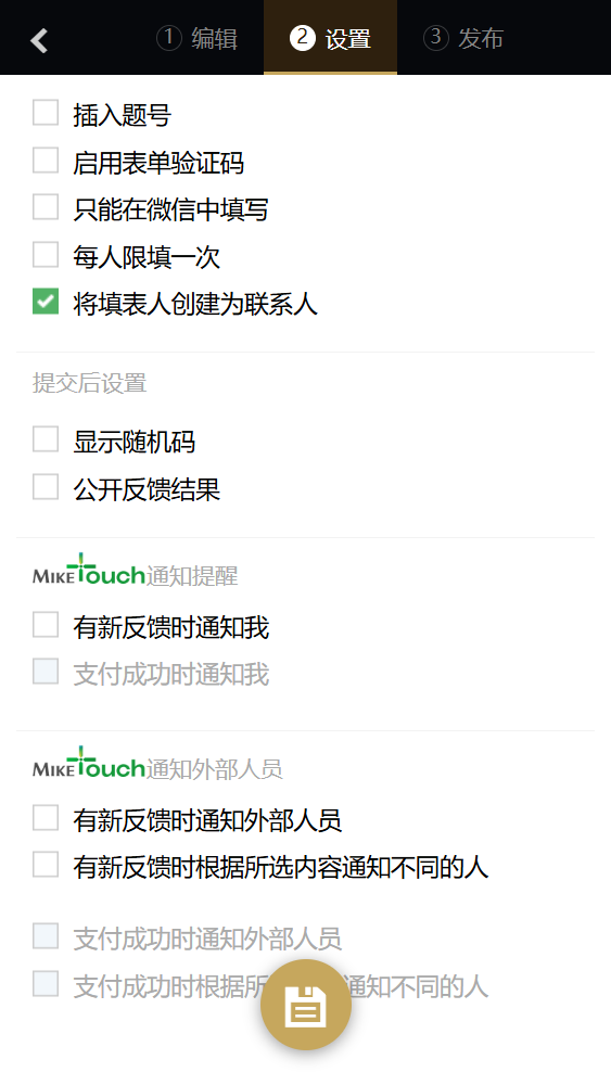 进入表单编辑页面,在页面最上方是可以切换表单制作步骤的三个功能菜单:①编辑、②设置、发布。