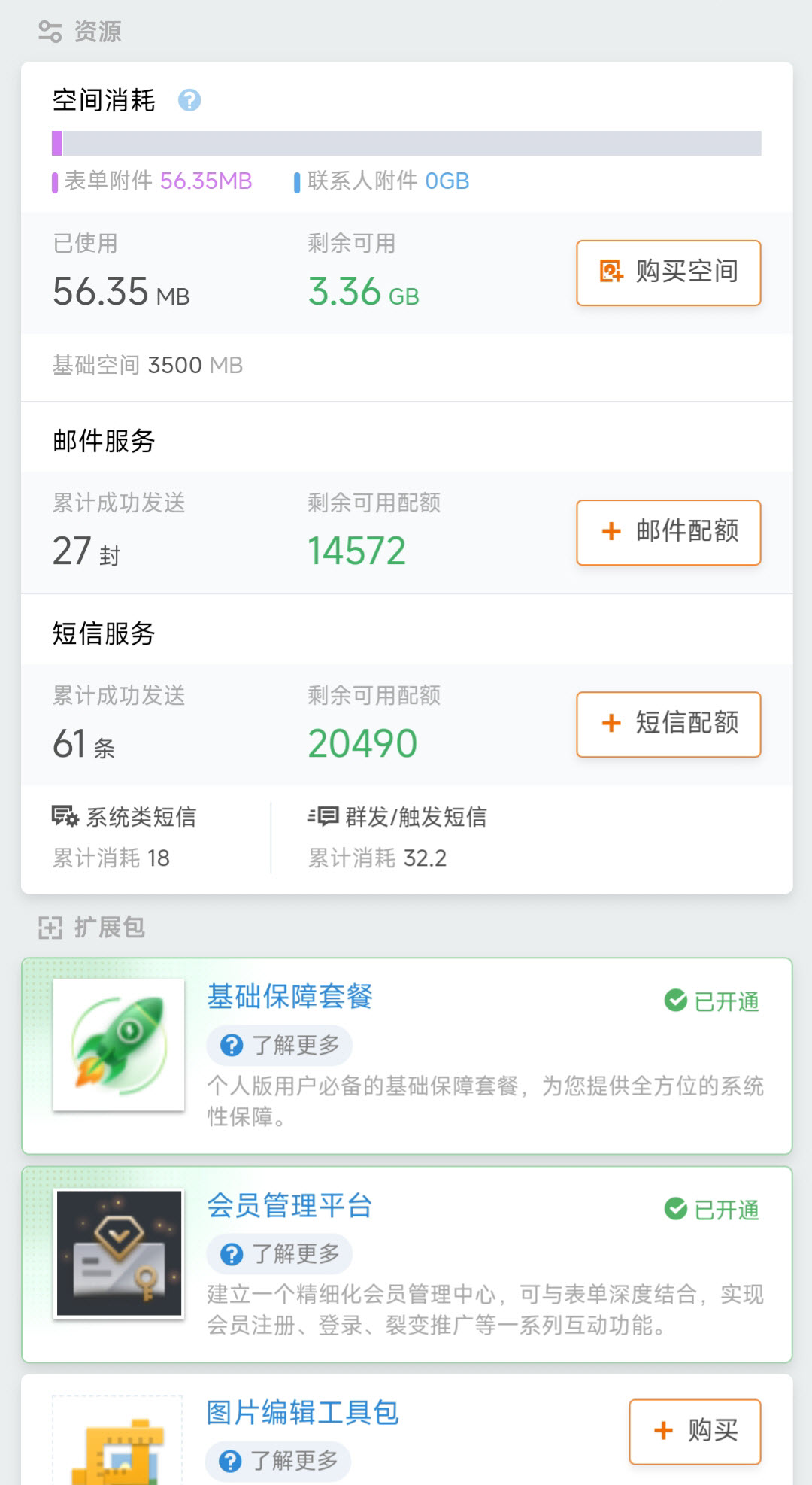 资源与扩展页面罗列了当前账号下的系统资源(空间,邮件配额,短信配额)和扩展包的使用和开通情况,方便您实时掌握资源剩余情况,快速进行充值开通等操作。