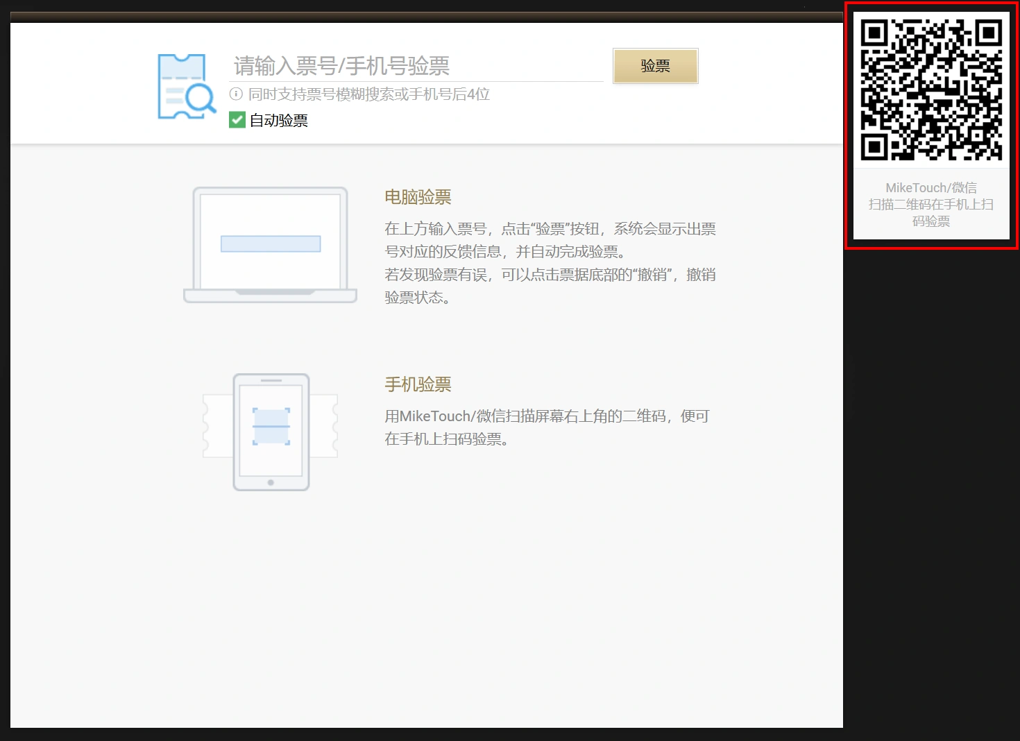 进入电脑端验票界面后,用MikeTouchAPP或微信扫描右上角的二维码,就可以进入“手机验票”界面。
