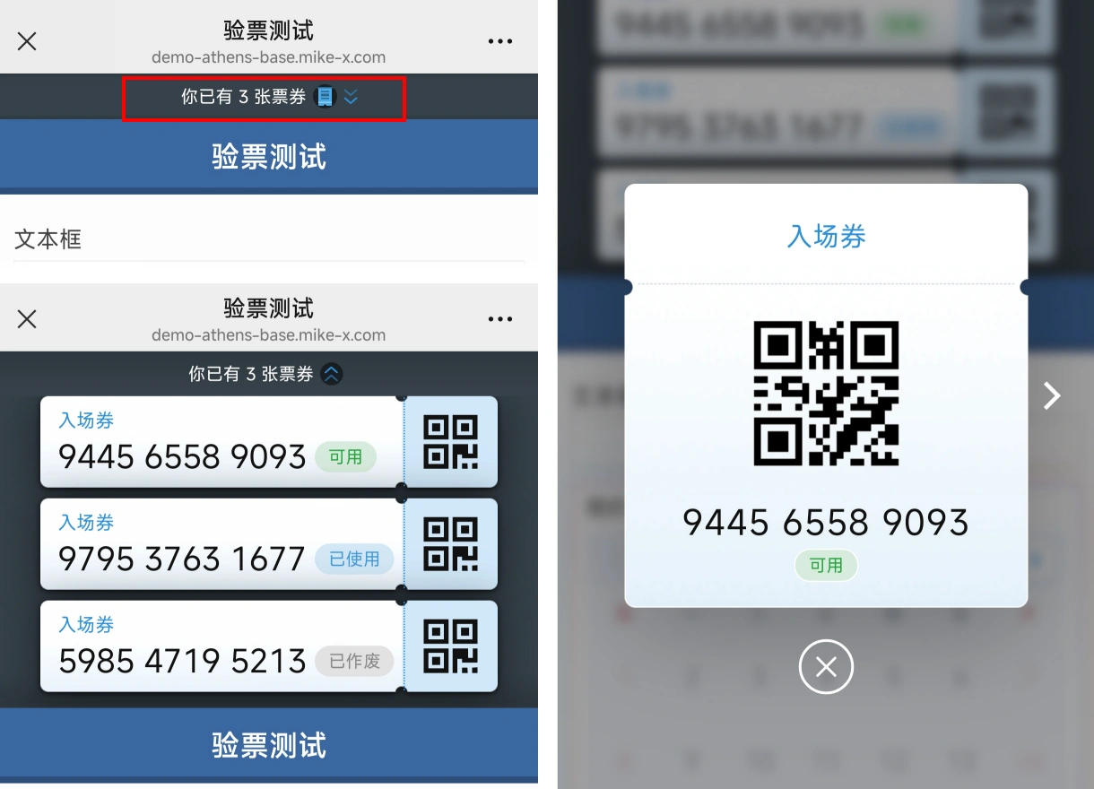 点击表单顶部的提示信息,展开查看已获得的票号和票券状态信息(系统不会展示未支付的无效票)。点击任意票券记录,可以在弹窗中查看完整的票券二维码,方便提供给工作人员进行扫码验票。